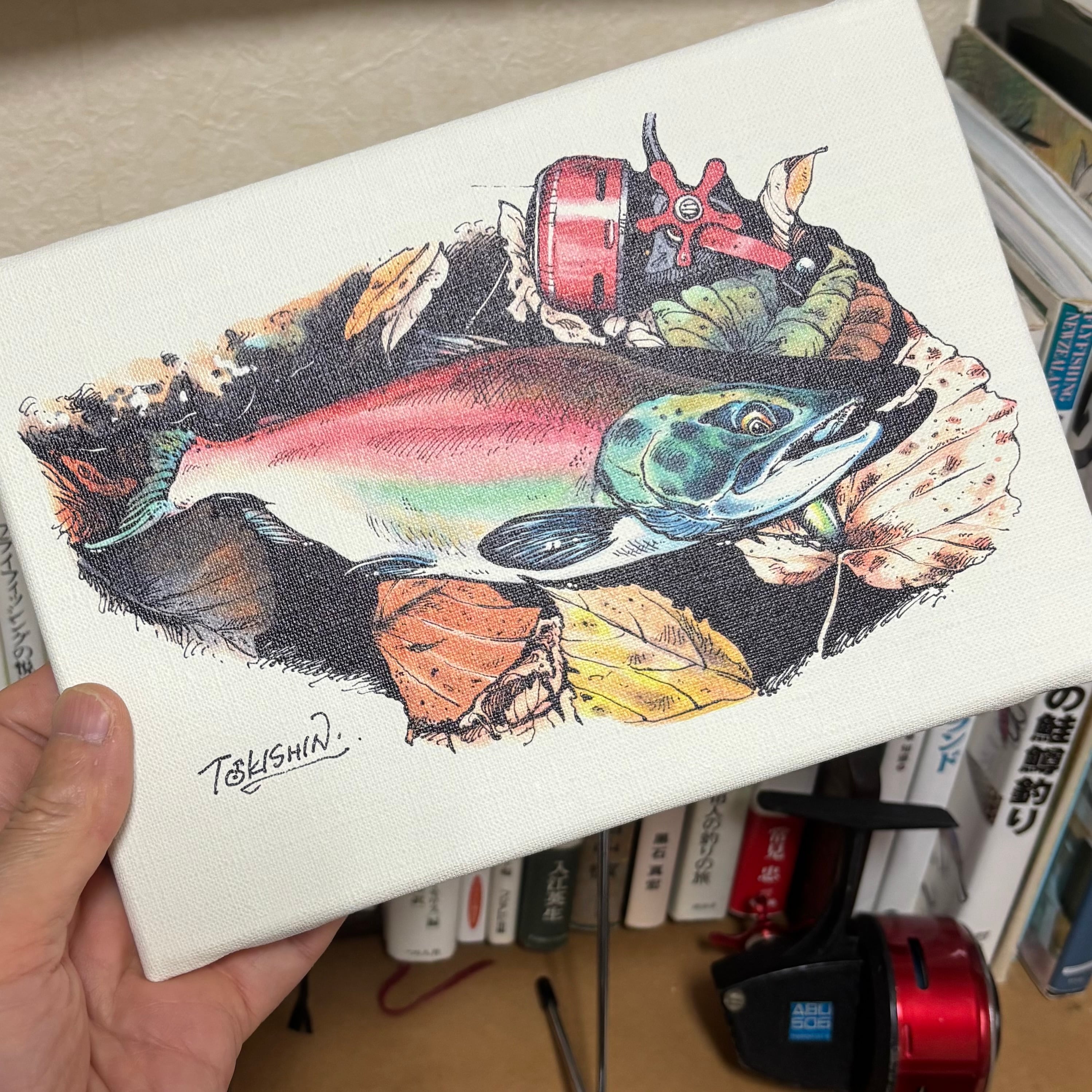 紅葉に染まった屈斜路湖で、紅いリールで釣り上げた、紅い魚(ヒメマス)を描いたお気に入りのイラストをキャンバスに高画質プリント。