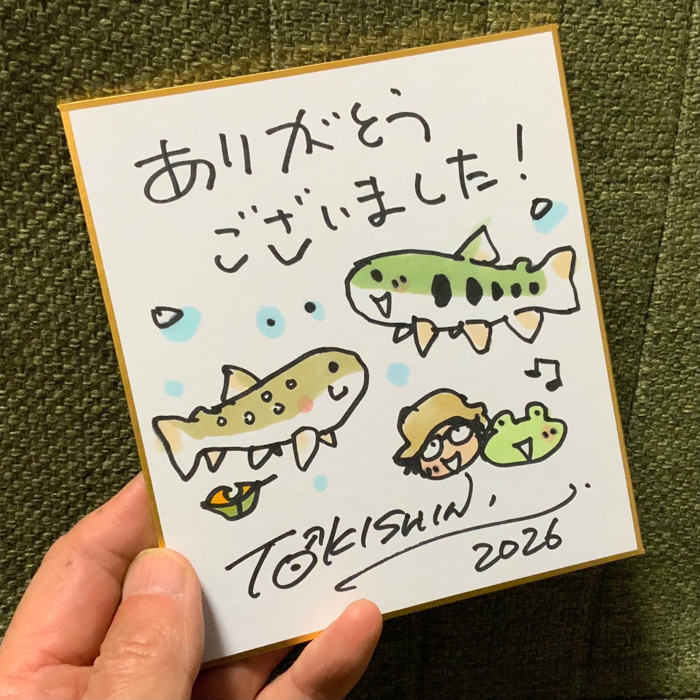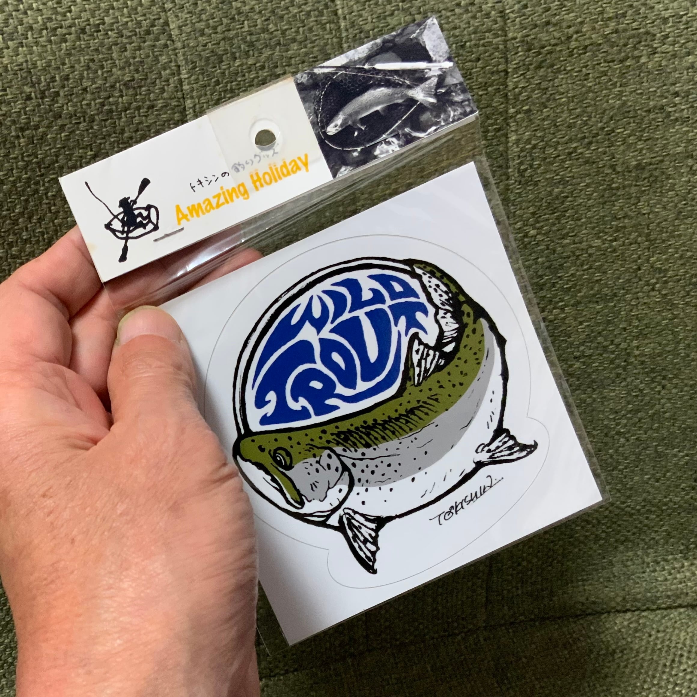 お求めいただいたお礼としまして、直筆サイン入りカラーイラストミニ色紙と、お蔵出しなものになりますが、Amazing Holidayを始めた頃に作ったレインボートラウトのステッカーを1枚おつけ致します。