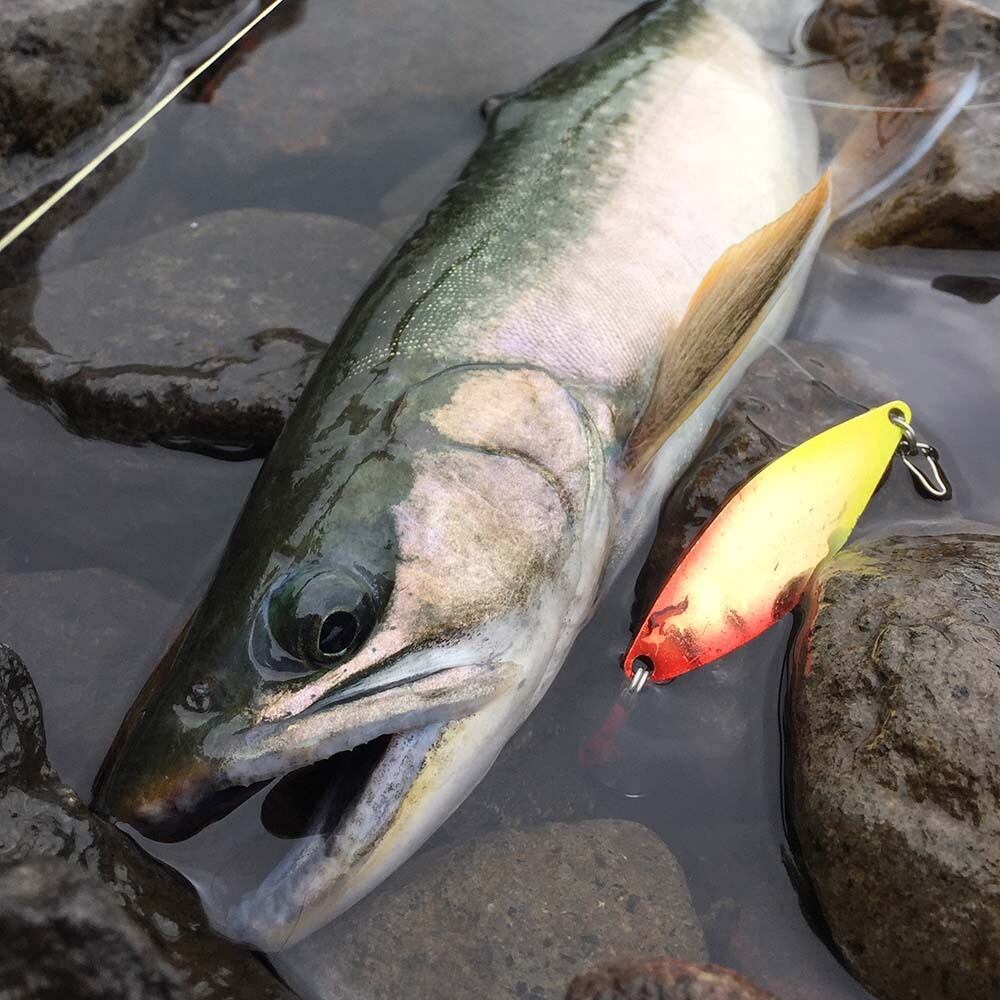 沖縄生まれのスプーンですが、全国各地のアングラーから注目され、北は北海道のイトウやアメマス、ロックフィッシュから南は沖縄・西表島のテッポウウオまで、淡水&海水の多魚種にアピール。僕自身も遠征で使用し、北海道やニュージーランドでトラウトを釣っています(今回のコラボカラーではありませんが、画像に道央の然別湖で釣ったミヤベイワナとニュージーランドで釣ったブラウントラウトも貼っておきました)。