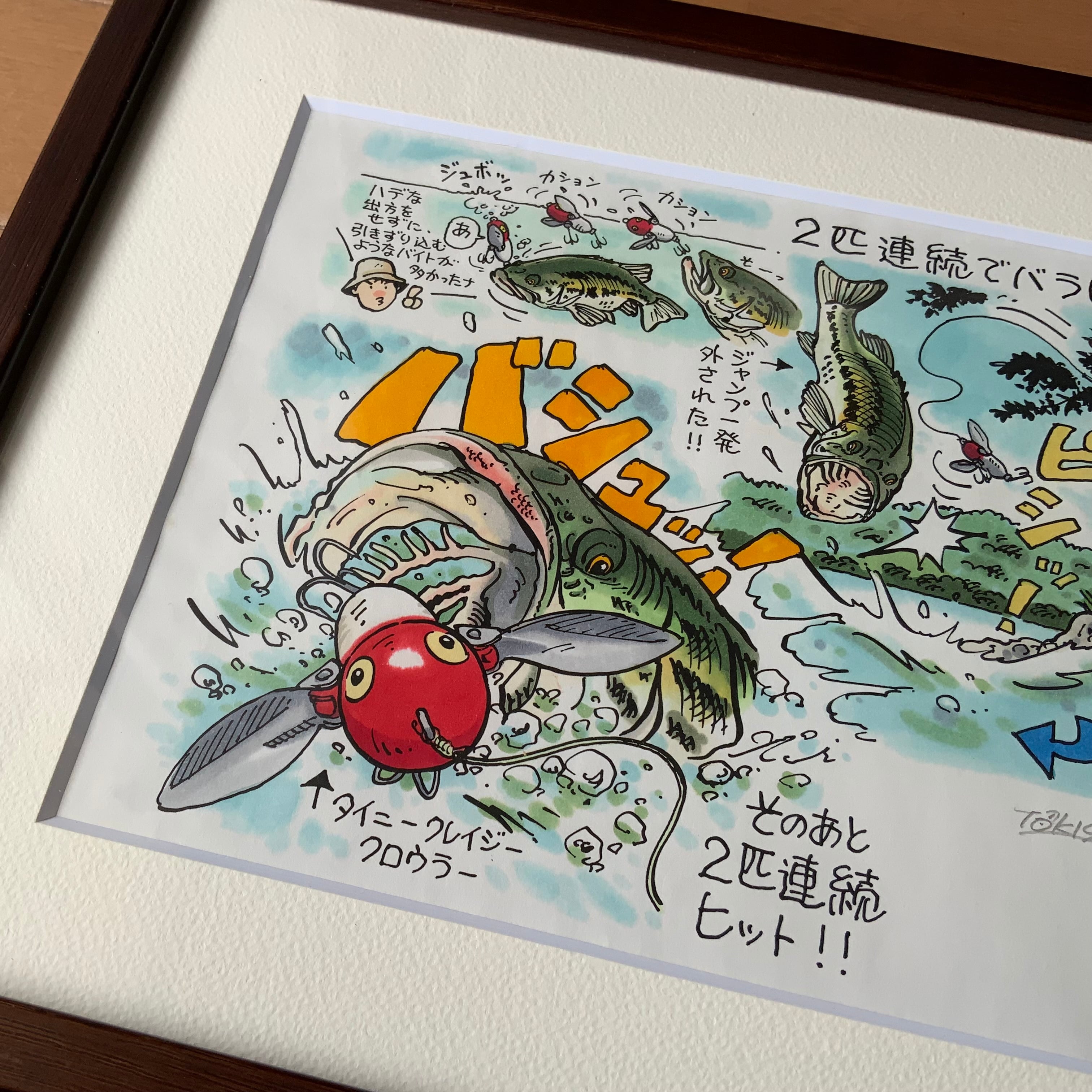 ロッド&リール2000年11月号掲載の『トキシンの危機一髪!』第40回釣行:千代田湖(山梨県)で使われたイラストの原画です。